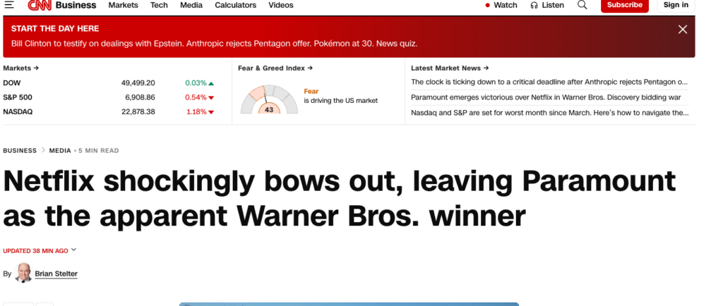 Late last year, there was some excitement as both Netflix and Paramount entered a bidding war for Warner Brothers Discovery which owns the Warner Brothers studio in Hollywood, owns streaming properties like HBO Max and Discovery, and owns some cable properties like CNN.