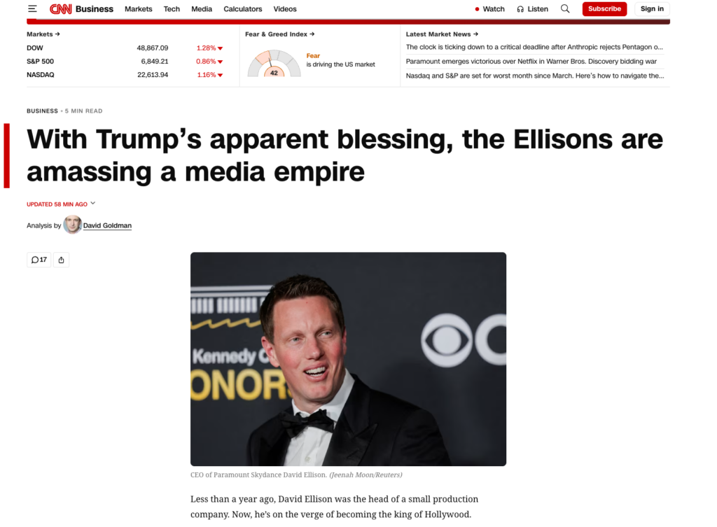 The second big take away is how the Ellison family (did I mention they are tight with the President?) has rapidly gained control of a large chunk of the US media assets. Read here.