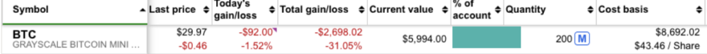 But anyway, invest, I did. On February 3, 2025, I took the plunge and invested $8,692.02 to buy 200 shares of the GRAYSCALE BITCOIN MINI TR ETF (BTC).