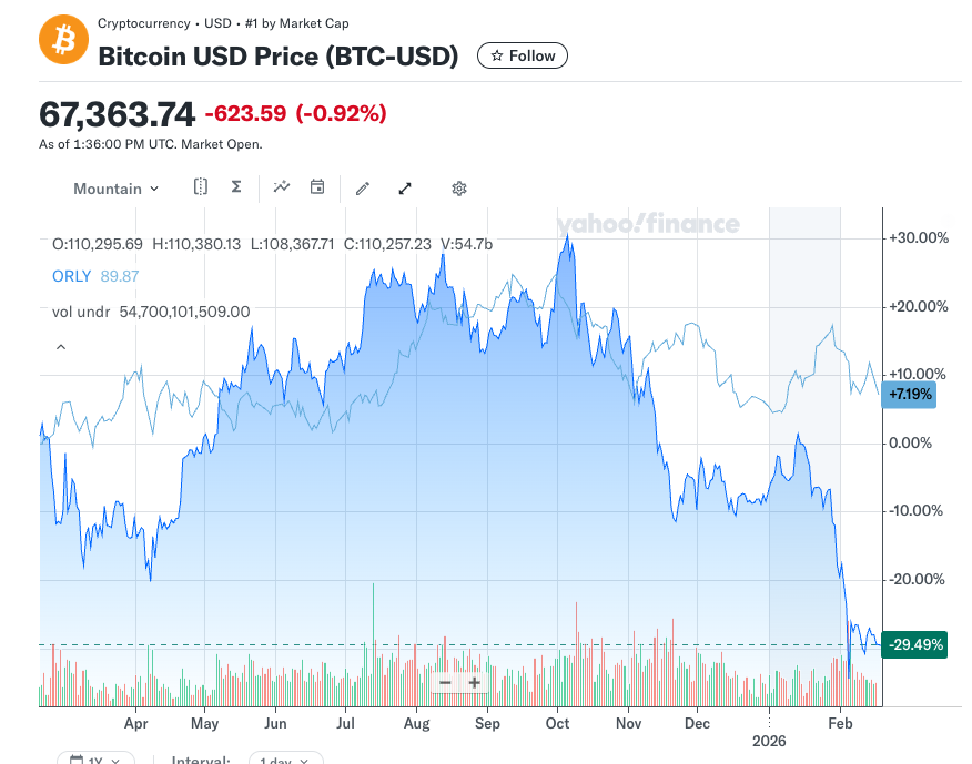 O’Reilly (the boring auto parts store) is the light blue line that is up 7.19% in a year while bitcoin is down 29%.