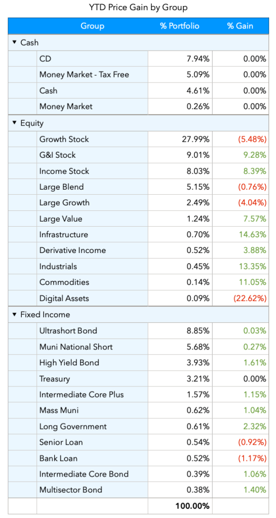 The chart shows the % of my portfolio allocated to each group, and the YTD price change.