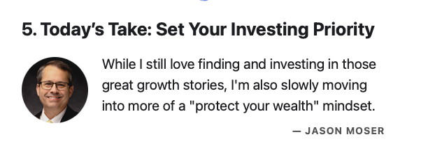 Like Jason, I’ve been working for almost 10 years to move to a protect-my-wealth portfolio. I am invested in more bond funds. I’ve moved to slow-growth dividend paying companies. My goal is to protect my wealth and generate the income I need in retirement.