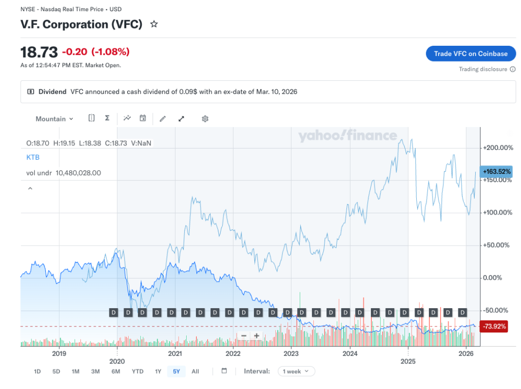 The few of us who know Kontoor likely know because in 2019, VF Corp, the maker of Vans sandals, and Timberlake and Northface outdoor gear decided to split off some of their underperforming brands. Sounds good, right? Let’s see how that went.