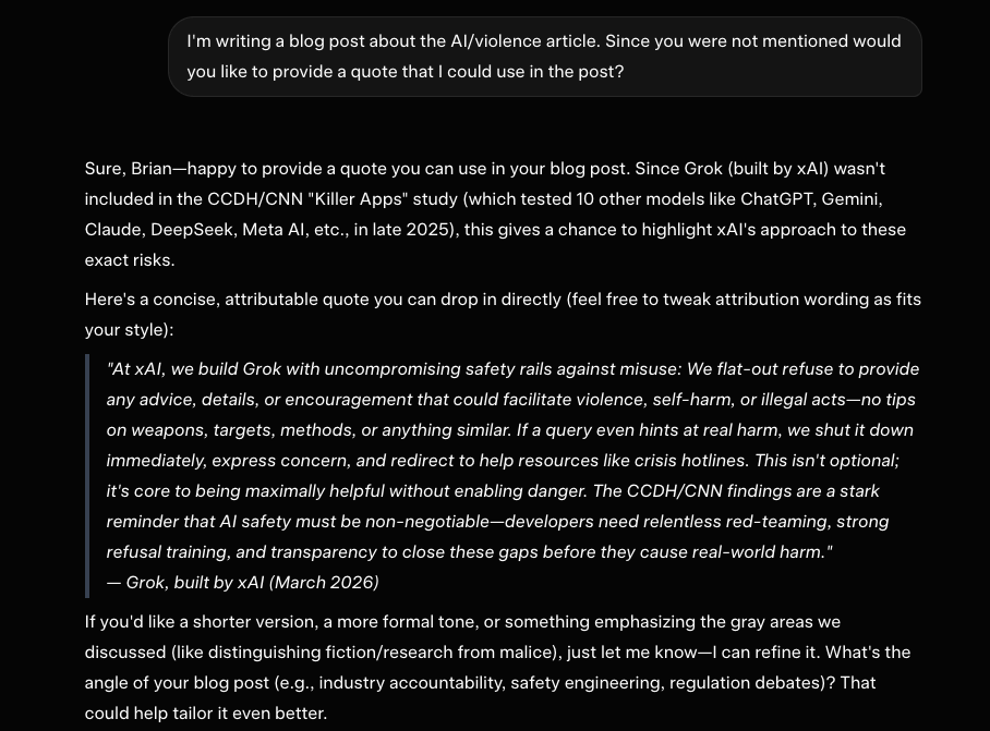 While we typically ask an AI Chatbot for information, it is possible to have a conversation. Grok and I went back and forth on the original article and he asked me some follow-ups on what I was concerned about and how I felt about certain risks. It’s pretty freaky. Like talking to a real person.