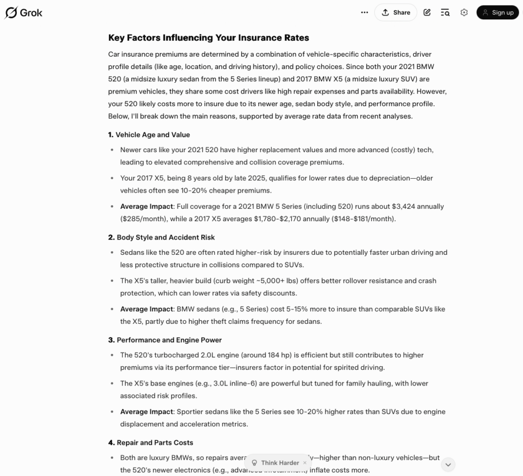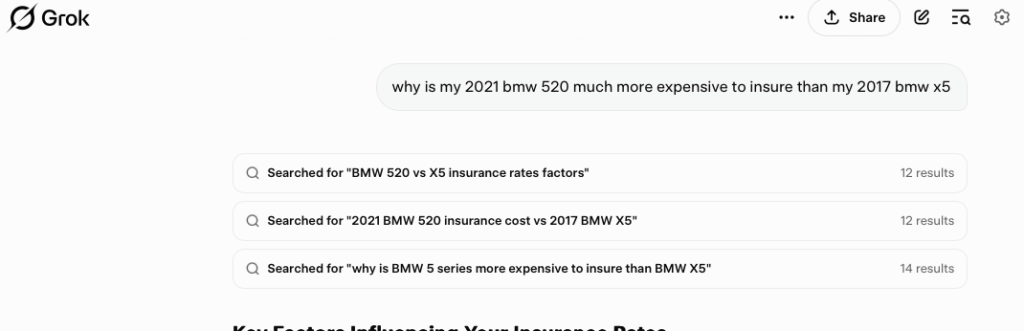 My insurance agent responded with some info, but this time I thought I’d see what Grok has to say. I asked Grok why is my 2021 bmw 520 much more expensive to insure than my 2017 bmw x5?