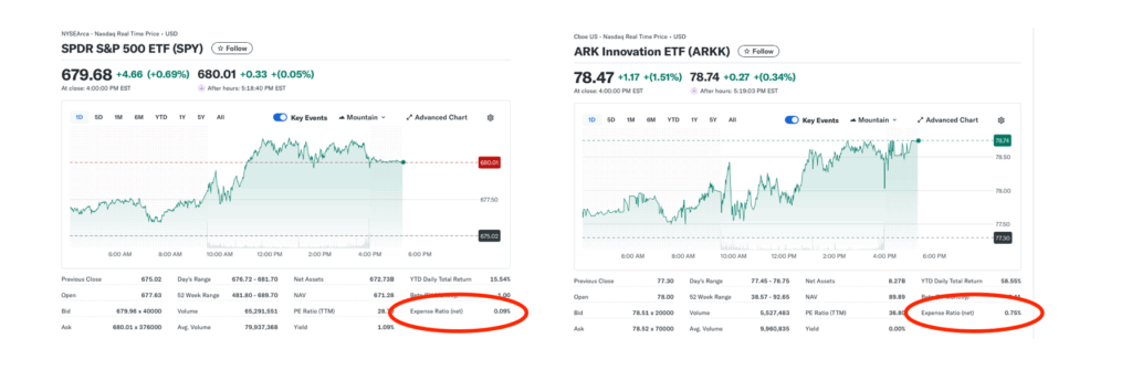 Let’s compare the expense ratio of the passive SPY to the ARK Innovation ETF.