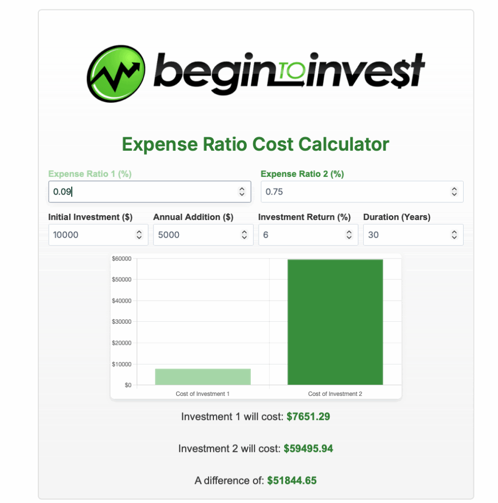 While this doesn’t sound like a huge difference, our assets grow over time, so we pay more $ as they grow. And the amount we pay in fees is lost growth. Check out a comparison from begintoinvest.com.
