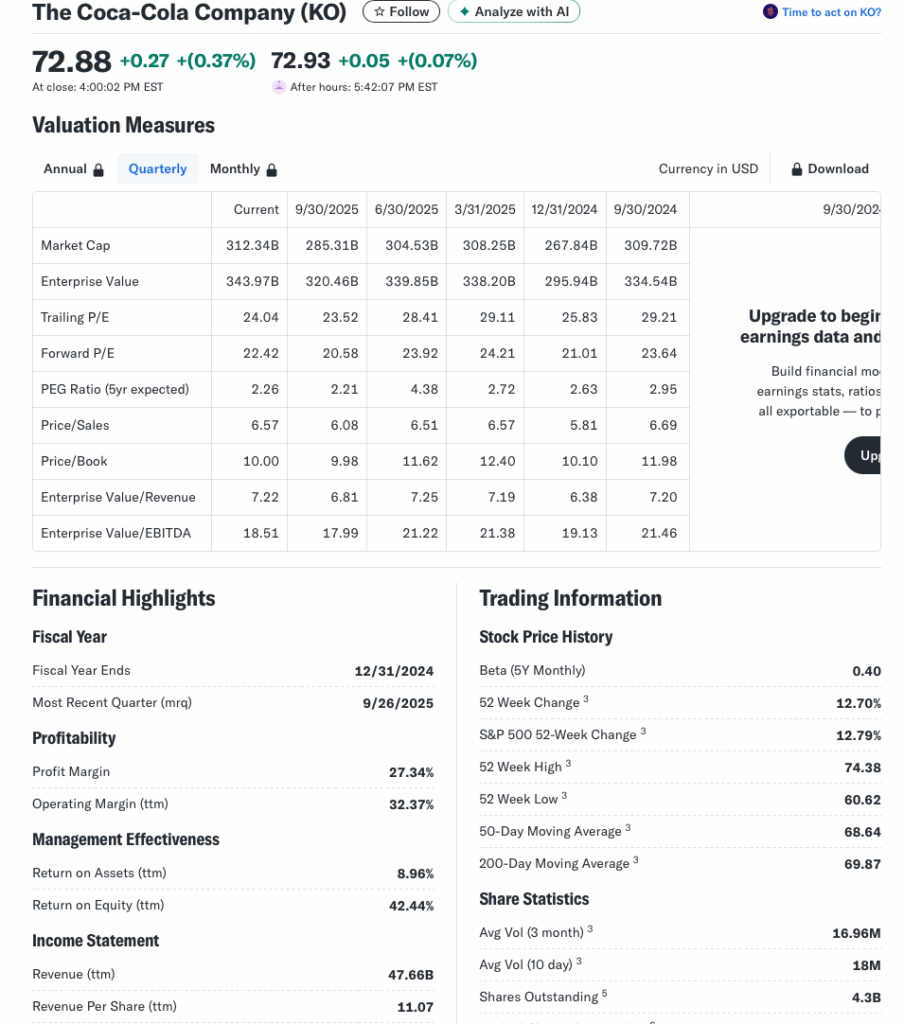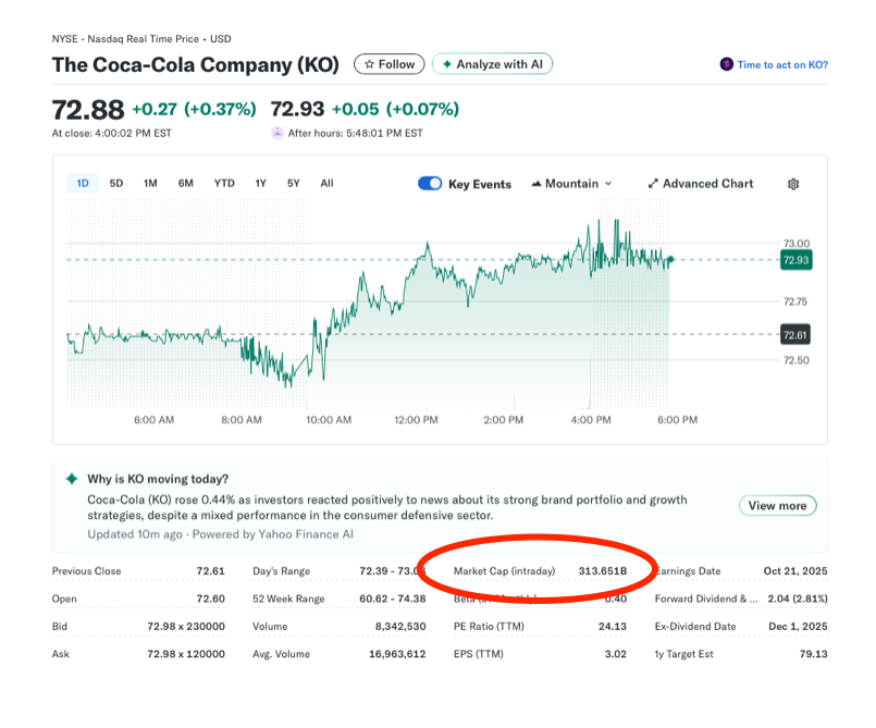The closing price of Coca Cola is $72.88. That means every share outstanding is worth $72.88 right now. $72.88 per share x 4.3 billion shares = a little over $300 billion, which is what we see here.