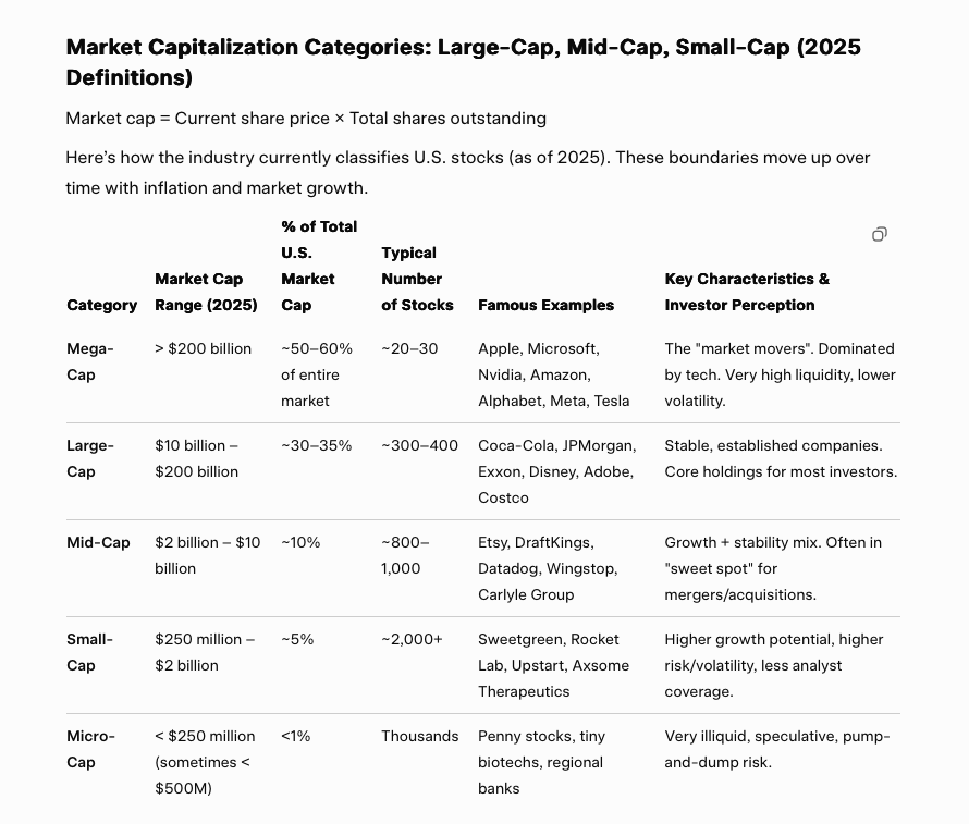 Large cap companies are big stable companies like Coca Cola, that have been around through market ups and downs. They tend to have lots of cash on hand, so much so that they pay dividends to shareholders because they can’t think of enough businessy things to do with all their money.