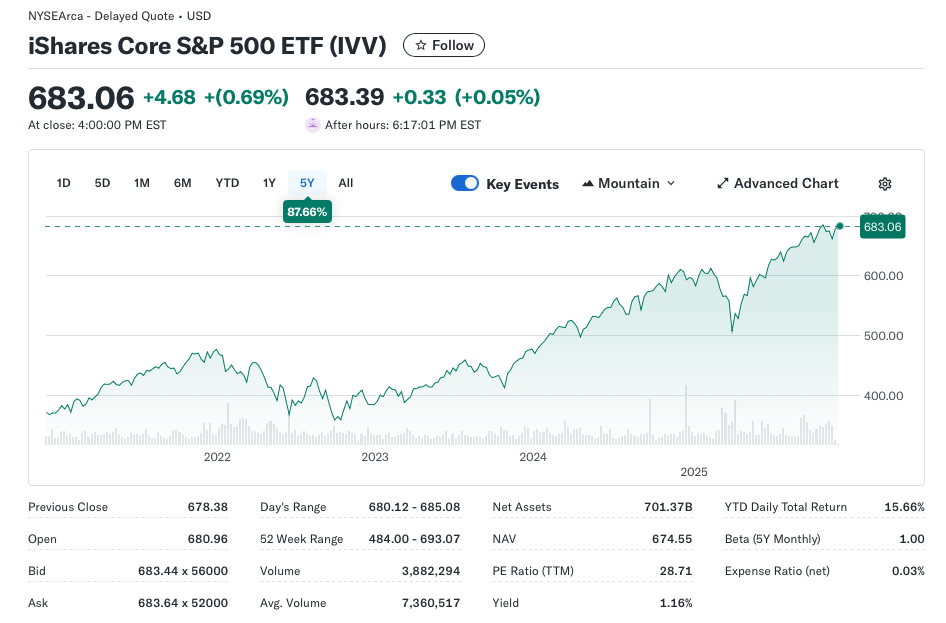 The expense ratio is 0.03%. It’s 1/3 the cost of SPY.