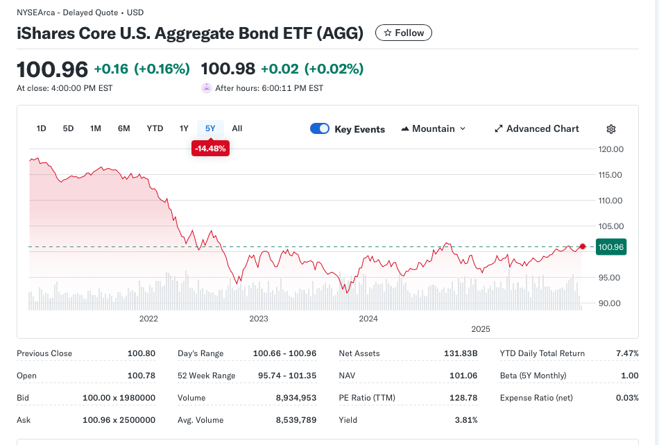For bonds, I like the iShares Core U.S. Aggregate Bond ETF (AGG)