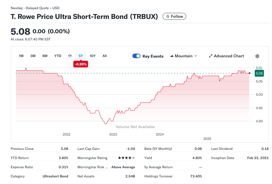 And I also like the T. Rowe Price Ultra Short-Term Bond (TRBUX). It holds very short term bonds which are less sensitive to changes in interest rates. We’re in an unusual period right now where this is yielding more than the AGG ETF, but weird things sometimes happen.