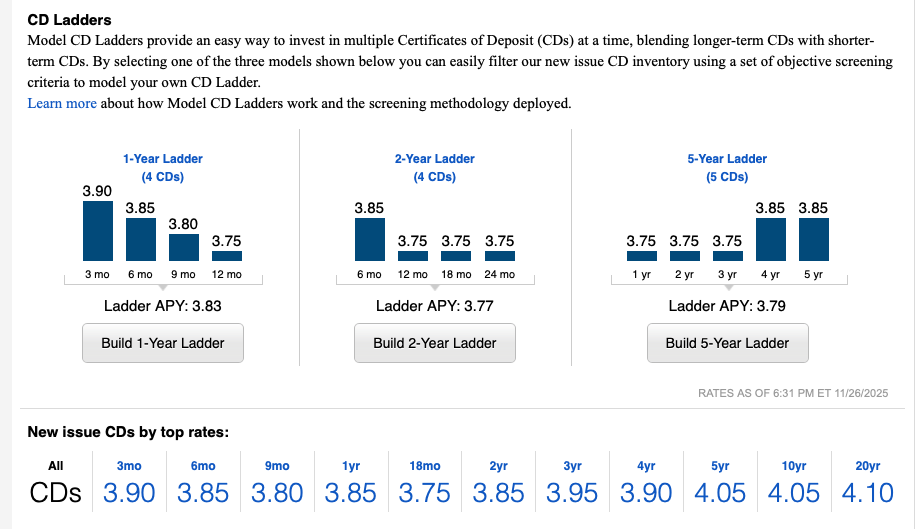 Cash that I need for upcoming expense in the next few years, since I’m retired and have no income, is in a CD ladder. I buy a 1 year, 3 year, 5 year and 10 year CD. I stagger these so something is maturing each year so that I have cash coming in, but I can take advantage of the higher rates of longer-term CDs.