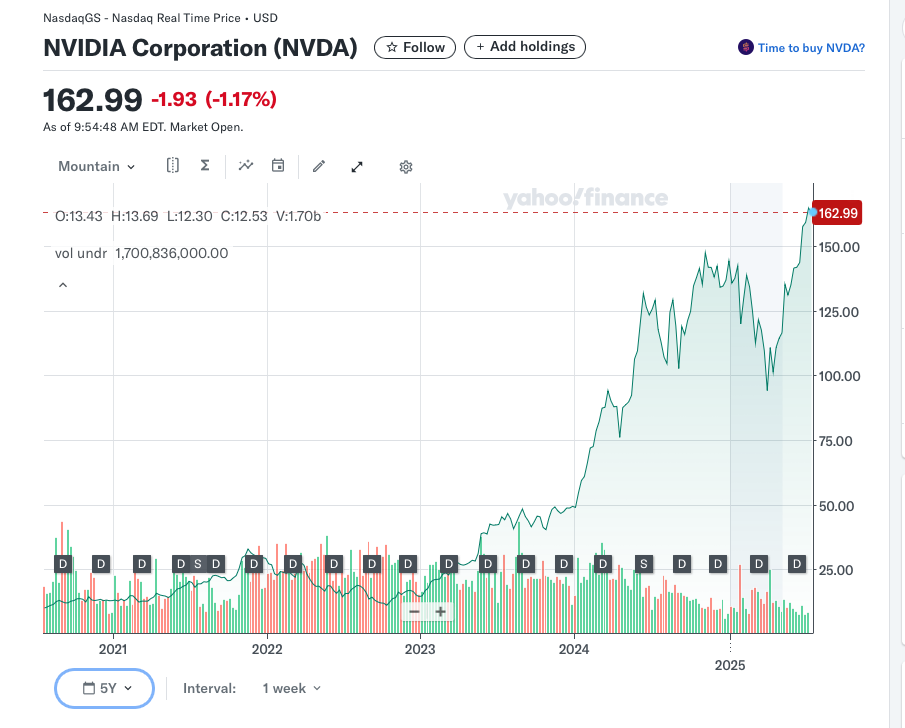 Take Nvidia (ticker: NVDA) for example. Look at this 5 year chart.