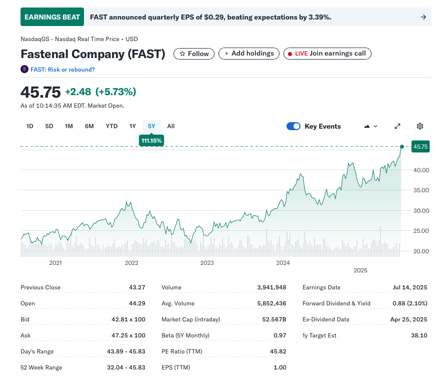 Fastenal beat earnings expectations today and the stock is up 5.73%.