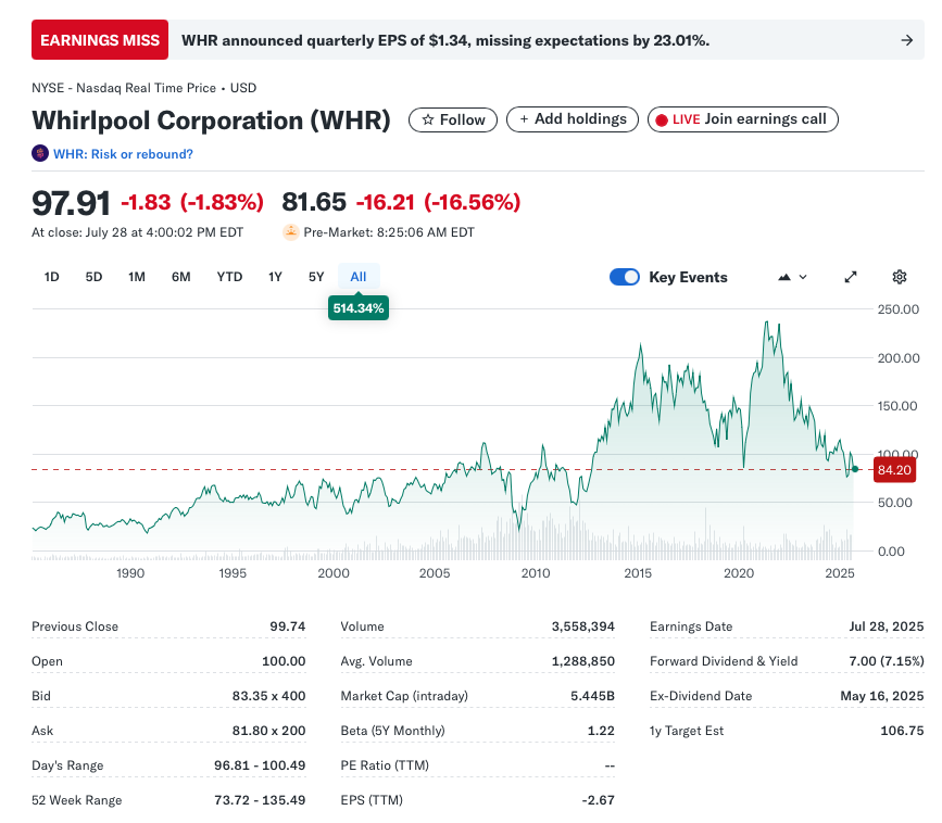 You’ll notice the big red EARNINGS MISS at the top of the yahoo quote. That’s what got me thinking about Whirlpool today.