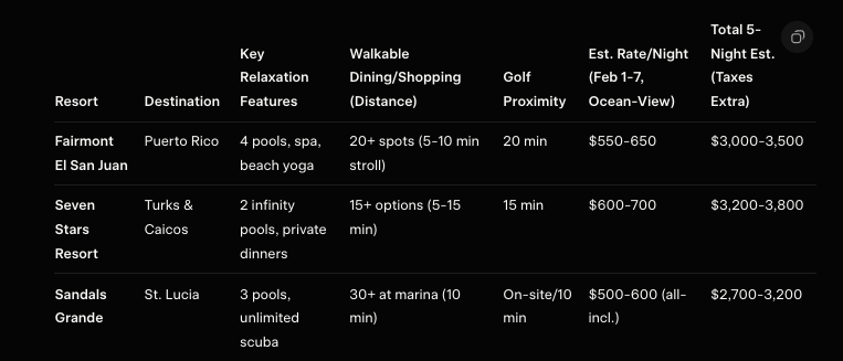 This is helpful, because I had lots of follow-ups. I asked for hidden-gems that were discounted. I asked about nearby golf courses, and about hiking. If I had to re-type the whole schpeil about Carribean, warm weather, quiet…over and over, my fingers would fall off – both of the ones I type with.