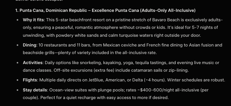 AI isn’t perfect. I still went to the travel sites, compared and booked on my own, but Grok provided lots of great suggestions and helped me narrow my search.