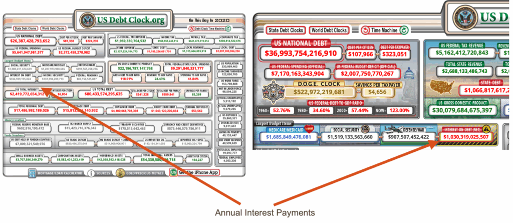Using the time machine feature on usdebtclock.org, I can see that in 2020, the US government was paying a whopping $334 billion every year to make interest payments on debt. At that time, we were spending $691 billion on defense, so debt payments (for which we got nuthin’) cost us almost half of what defense cost.