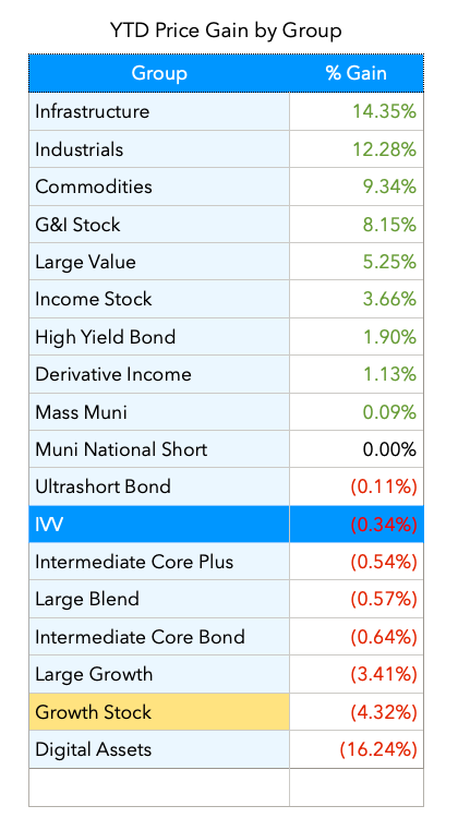 If I look at my investments by group, the growth stocks that have driven the lion’s share of my earnings for the past 20 years are lagging – big time. This year Caterpillar, Cummins, Fastenal and Carrier are killing it.
