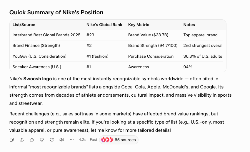 But it’s Nike. The name continues to place at the top of the world-wide most recognizable brands list. Just ask Grok.