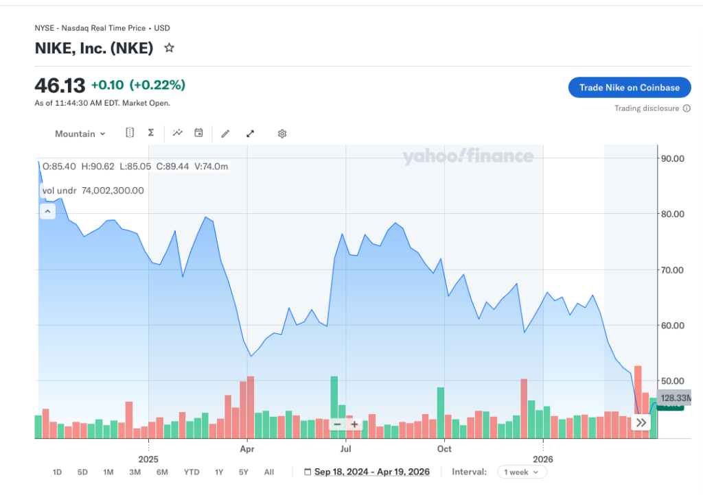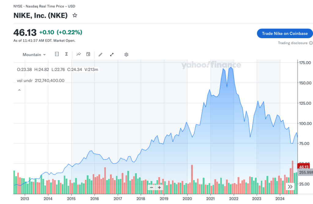 Nike has dropped all the way to $46 per share after hitting over $156 per share just a few years back.
