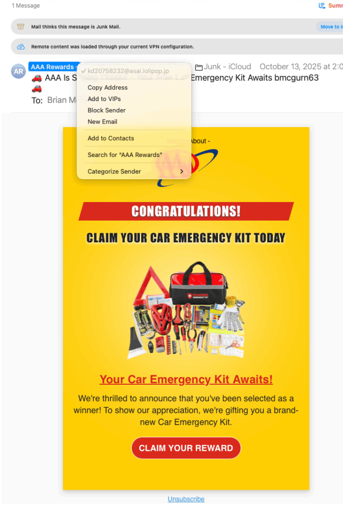 I almost fell for it yesterday. I got a very professional looking email from AAA saying click to claim my free roadside assistance gift. I’m a AAA member and this is the kind of stuff they do, right? Then I moticed they addressed me as bmcgurn63 – my email address not my name. And then I checked the sender email and it was not from AAA.com, or anything like it.