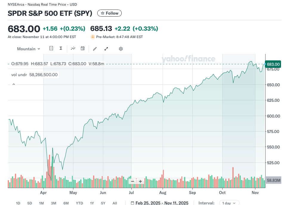 The SPY price fluctuated between a low of 550 and a high of 683. I bought some shares at relatively high prices and some at relatively low prices.