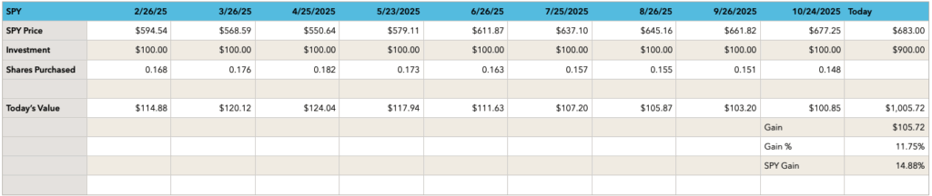 The row below shows the $100 I (theoretically) invested and the shares purchased is calculated by dividing the $100 purchase by the price of SPY to get the number of shares I purchased on that day.
