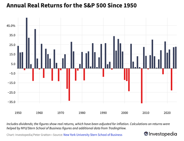 And the S&P 500 is volatile. It has big up years – it was up over 20% in both 2023 and 2024. I bet you forgot. You were staring at your screen in November 2024, watching the gains. No one remembers.