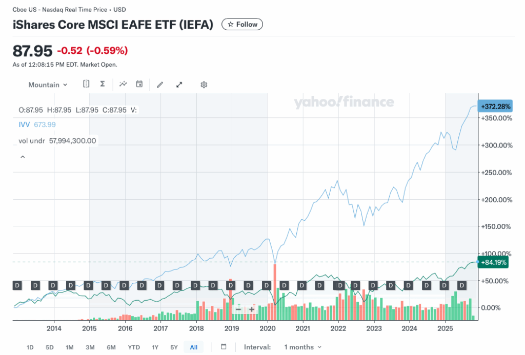 It sounds right, but that story has just not played out as we’d expected. Look at the iShares emerging markets index ETF v. the iShares S&P 500 ETF over the last 10 years or so.