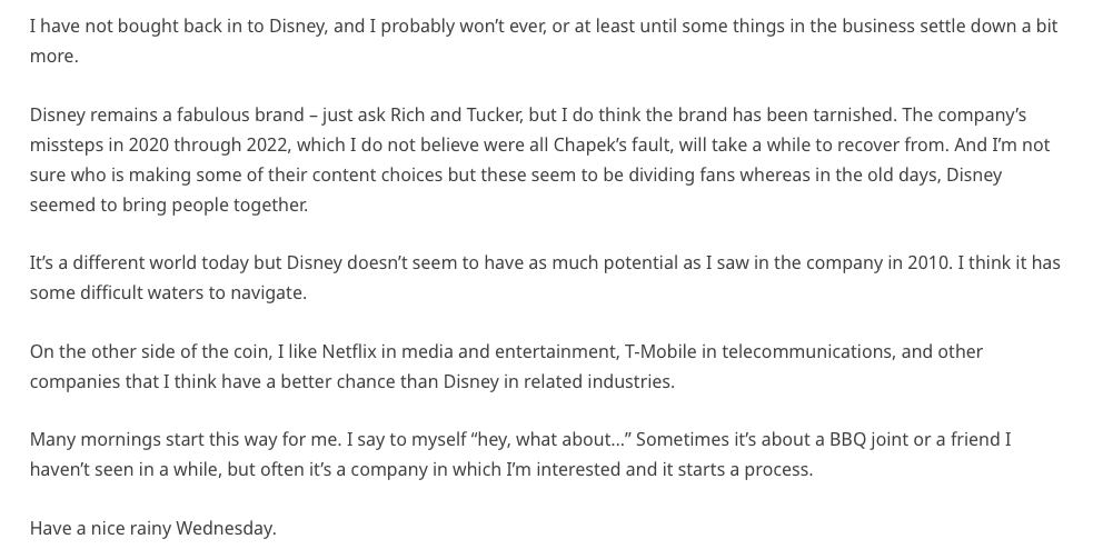I sold the rest of my shares in 2022 as the Chapek controversies continued to rage. Chapek was the CEO (briefly) and he was battling the state of Florida. I covered this here so I won’t rehash.