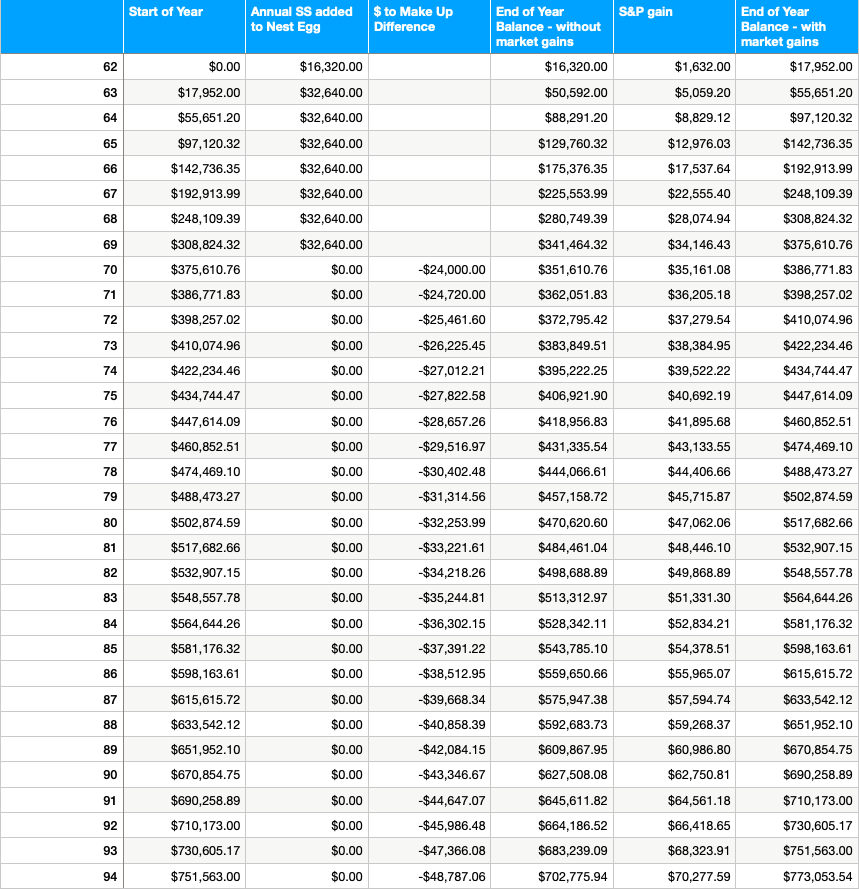 My nest egg grows until age 70 where I start taking my social security payments in cash AND I pull $24,000 from my nest egg to cover the difference between the higher payment I’d get at age 70 had I waited, and my current age 62 payment.