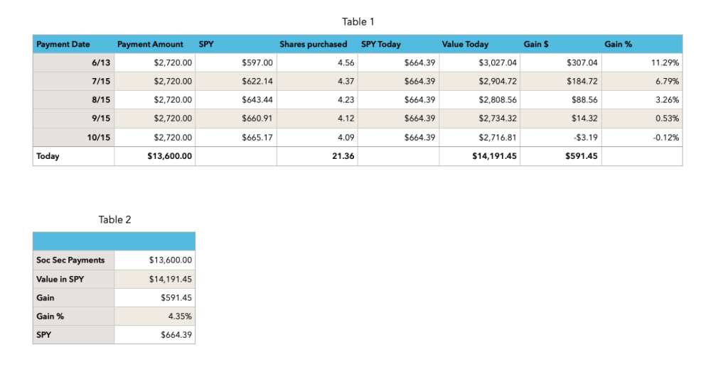 Each month, I take my $2,720 and buy shares of SPY. My 6/13 payment is up a whopping 11.29%, while my most recent 10/15 payment is down slightly.