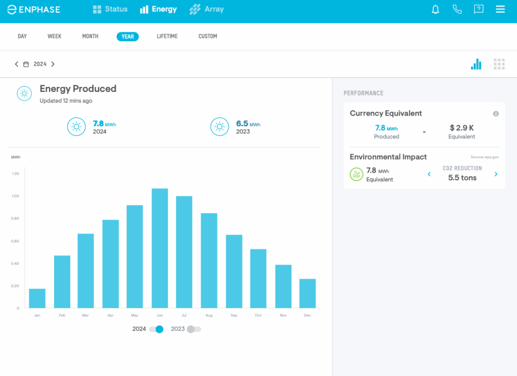 In the summer months, I’m generating over 1,000 kWh of energy per month. In Jan and December, I generate about 200 kWh.