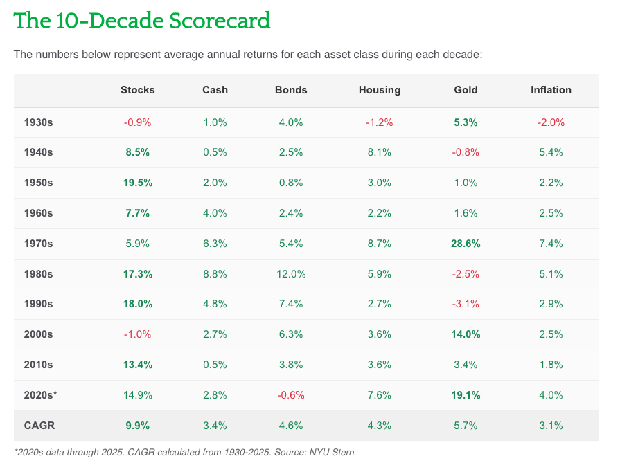 We see some decades performed better than others, and the great depression and the 2008 financial crisis knocked out a full decade off stock returns, but overall we see a 9.9% stock return which beats other asset classes.