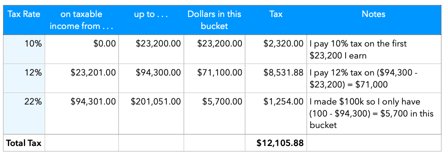 They key point here is that just because my income was $100,000, doesn’t mean I’m taxed at the 22% rate. I’m actually paying about 12% ($12,105 in taxes divided by $100,000 in income).