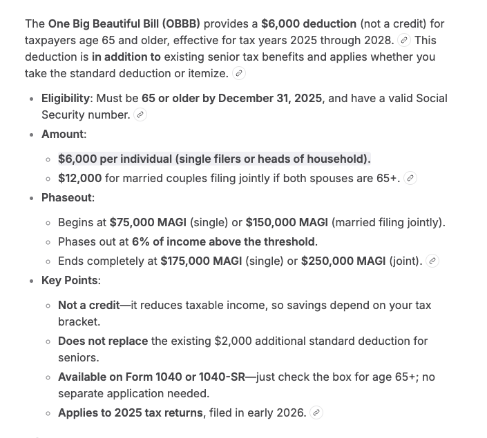 For those 65 and older by December 31, 2025, you are eligible for the new $6,000 senior deduction that was part of the One Big Beautiful Bill that was passed in 2025.