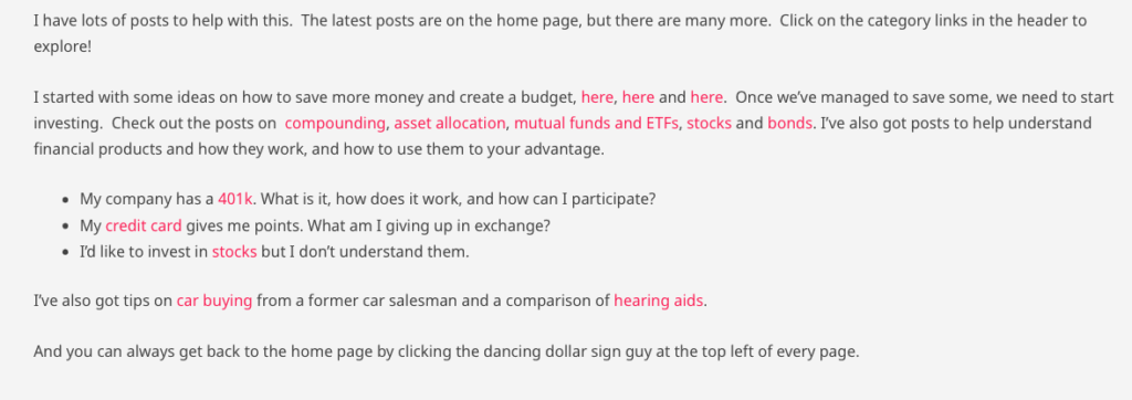 And if you’re not sure where to start, the homepage has an agenda for how to go about this. Go here, and click the red links to learn about budgets, saving, retirement plans and credit.