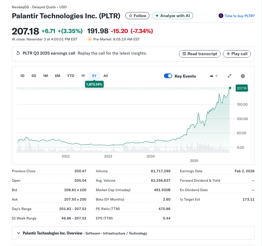 Palantir has had a good run. It’s up 173.94% year-to-date. The S&P 500 is up 16.65%, so Palantir is crushing it.