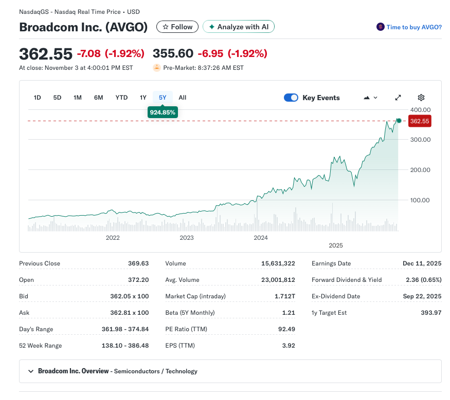 Broadcom is no Palantir, but it’s had a huge run-up as well.