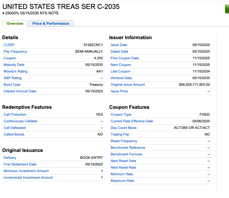 In May of 2025, the US government needed some cash. It needed more than it had so it issued this bond for $56 billion.