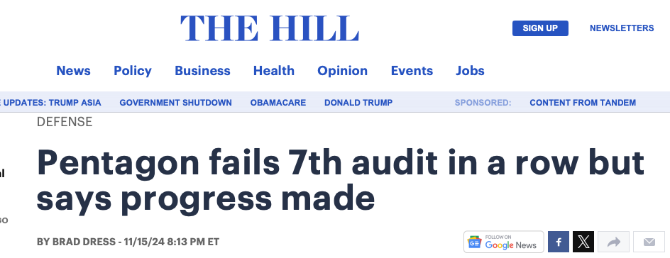 And then there was military spending. This got a lot of press before the election. The US defense department would never pass an audit – can you believe it? Must be those $10,000 toilet seats. Not kidding – read here.