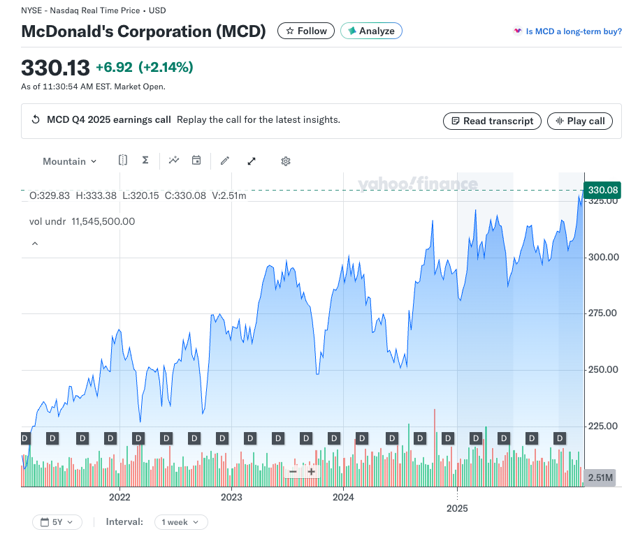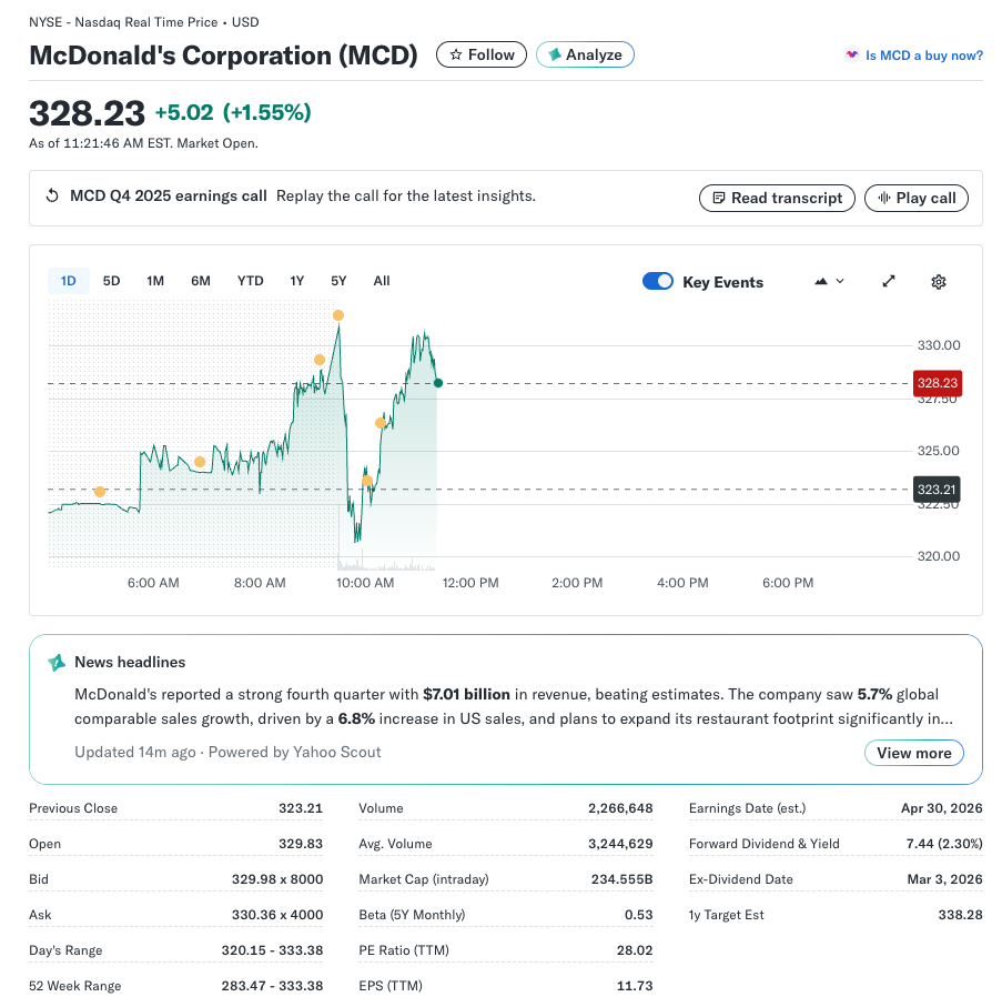 Here’s what Yahoo Finance has to tell us about McDonalds.