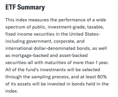 So, we could buy shares of an ETF like the Vanguard Total Bond Market Index Fund (BND). According to Vanguard: