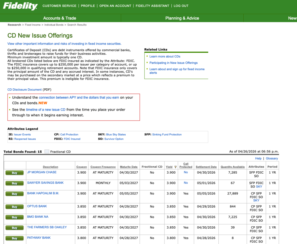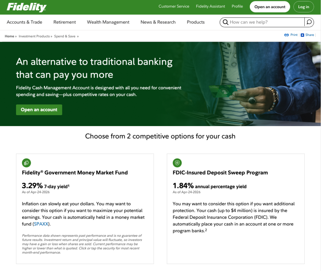 The Fidelity cash account has no monthly fee. I can choose FDIC insured banks as my default and I’ll get about 1.84% interest – better than 0.01% or I can choose a safe but not FDIC insured money market fund that gets 3.29%.