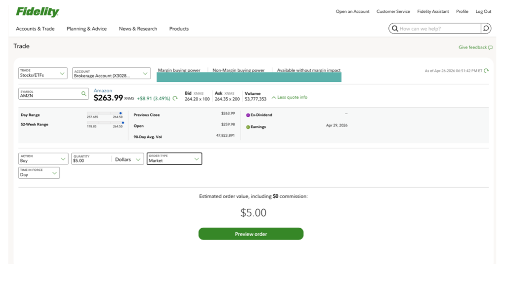 The price per share of Amazon is $263.99. So for $5, I’ll get 0.01894 shares of Amazon. Not a lot but it’s something.