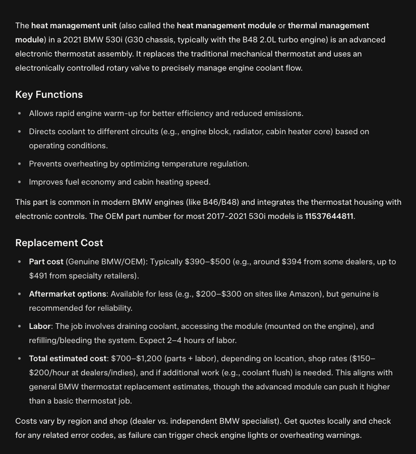 That’s how I learn that there is a problem with the Heat Management Module. I asked Grok, “what the heck is a BMW heat management module.