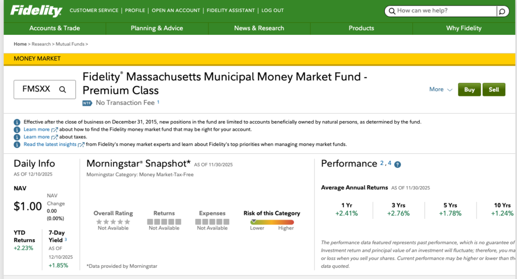 Fidelity® Massachusetts Municipal Money Market Fund – Premium Class is not going to make you rich. A YTD return of 2.23% doesn’t look like much until you consider that we won’t pay either state or federal tax on the income it produces.