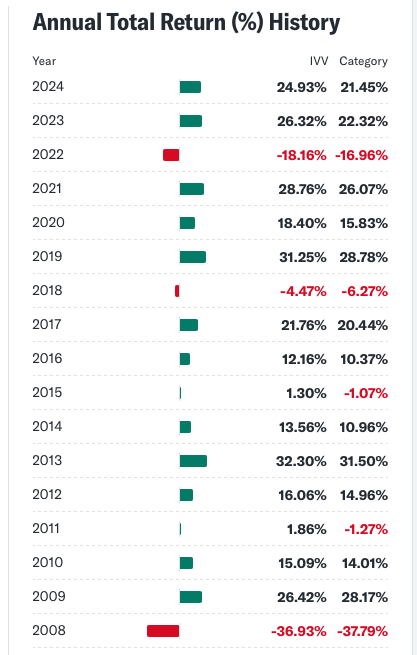 IVV was down big in 2022 and 2008. But look at 2019, 2020, 2021, 2023, and 2024.